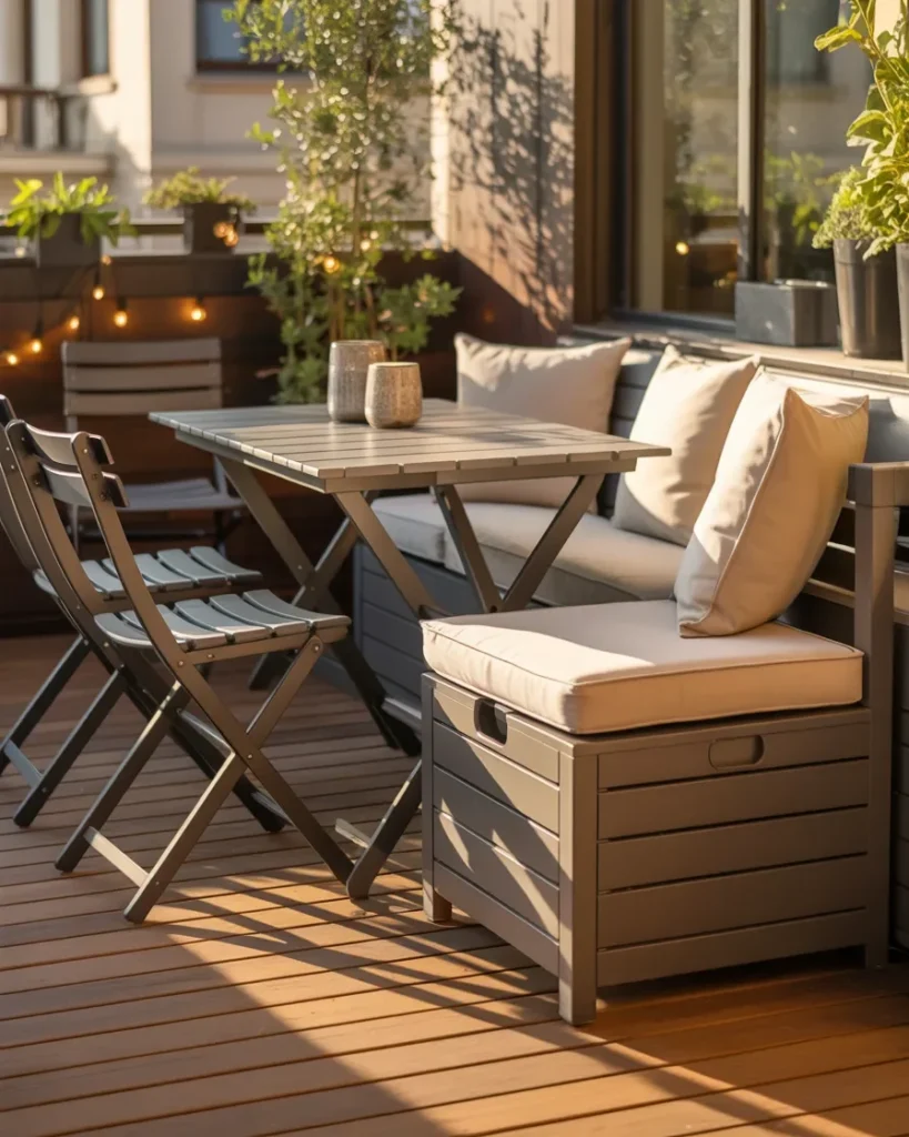 This setup offers the perfect blend of functionality and style for a compact outdoor space.