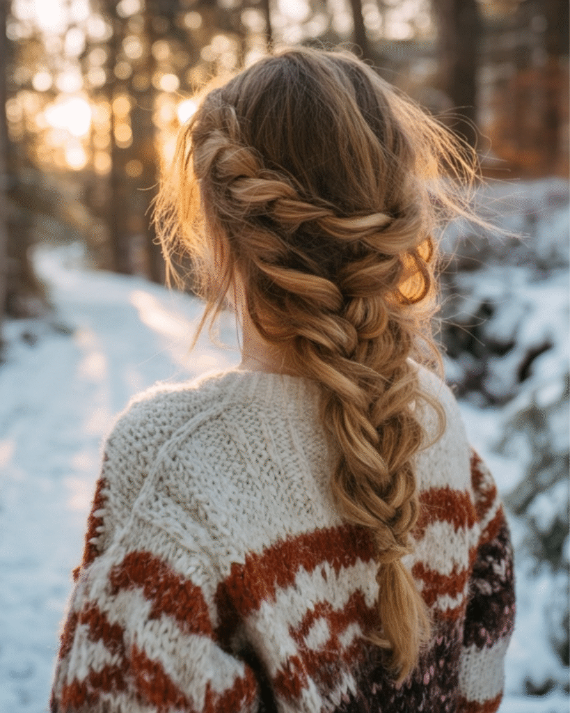 Strands of hair are intentionally left free, adding a natural flow and movement that complement the wintery background. The rustic, cozy sweater paired with the soft curls in the braid evokes a sense of warmth and comfort amid the cold.