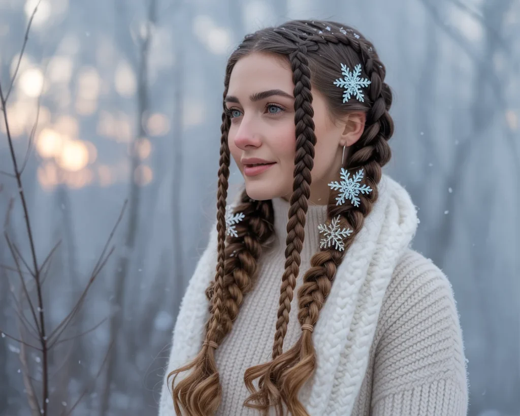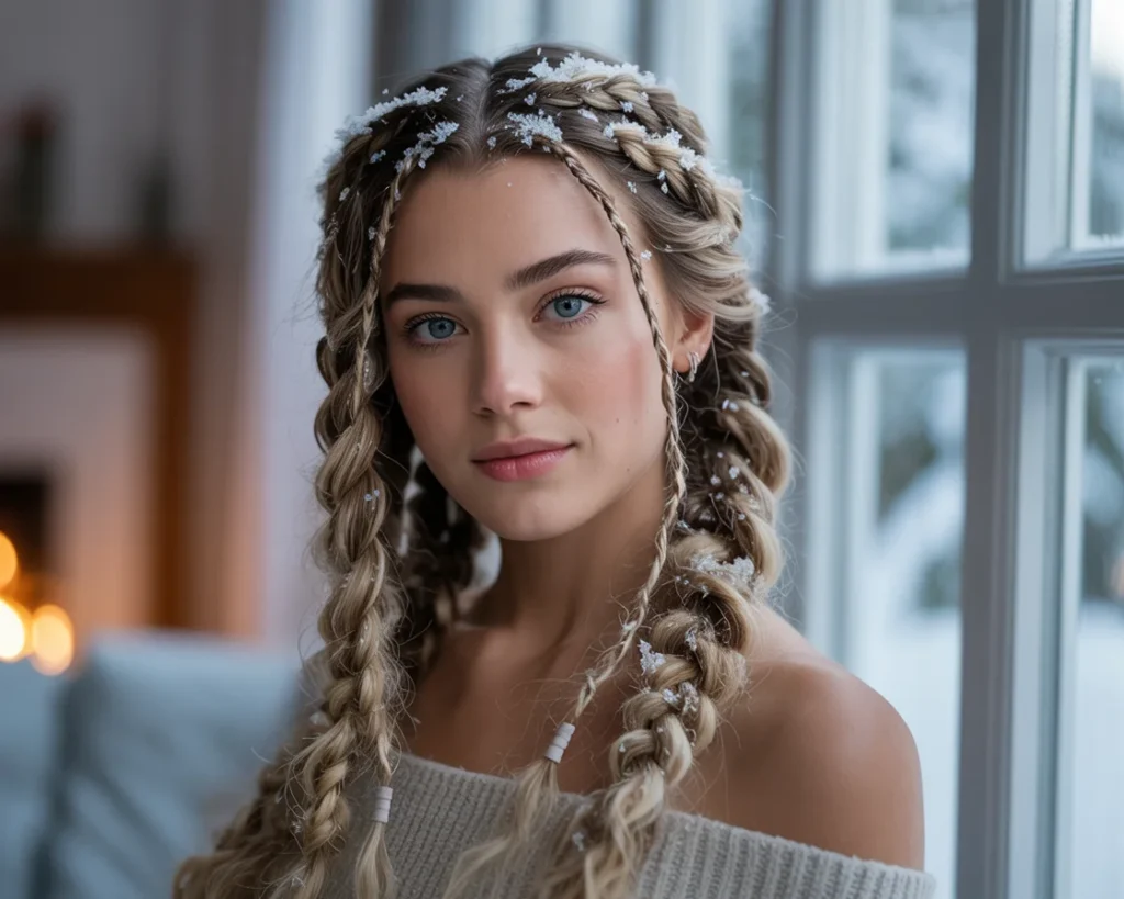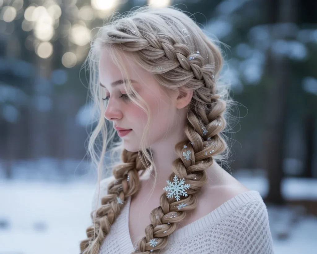 Add a frosty touch by weaving in small snowflake clips or spritzing the braids with shimmering snow spray.