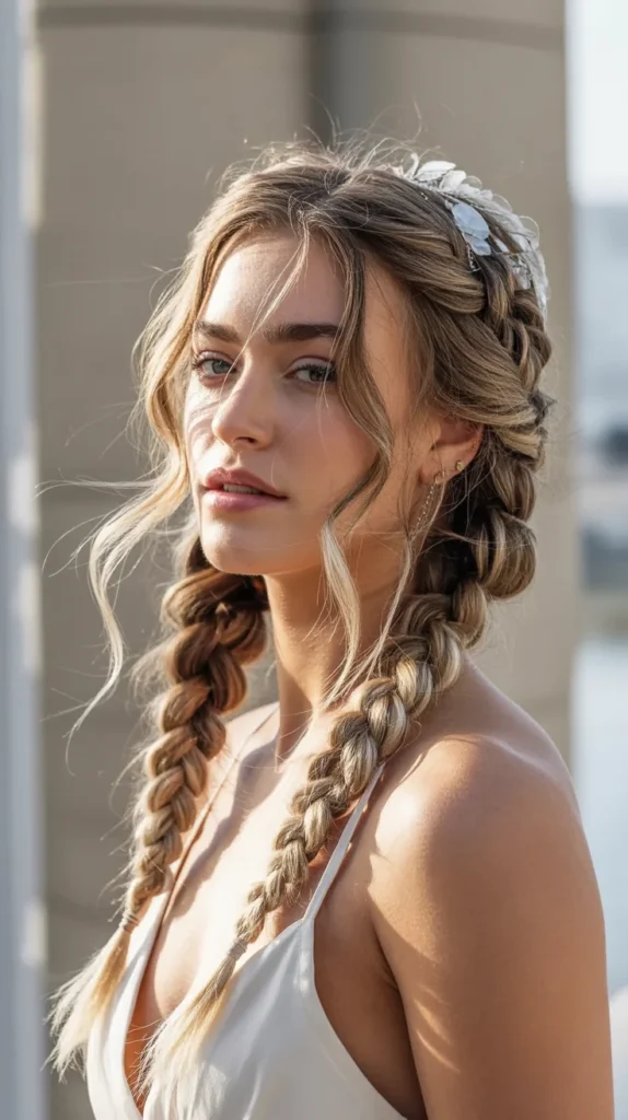 Enhance the style with silver or white hair accessories or wrap the braids with a shimmering silver thread for a frosty finish.