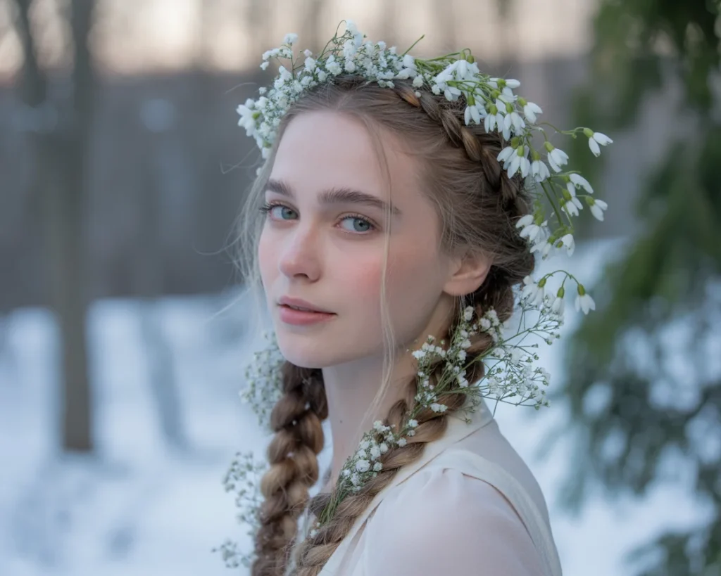 This hairstyle is perfect for a winter photoshoot or any occasion where you want to channel a sense of ethereal beauty.