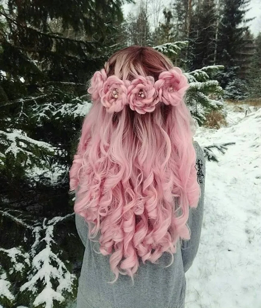 A dreamy blend of soft pink curls and a floral crown creates an enchanting snowy hairstyle. The soft waves of the hair flow effortlessly down the back, their delicate curls adding volume and movement to the look.