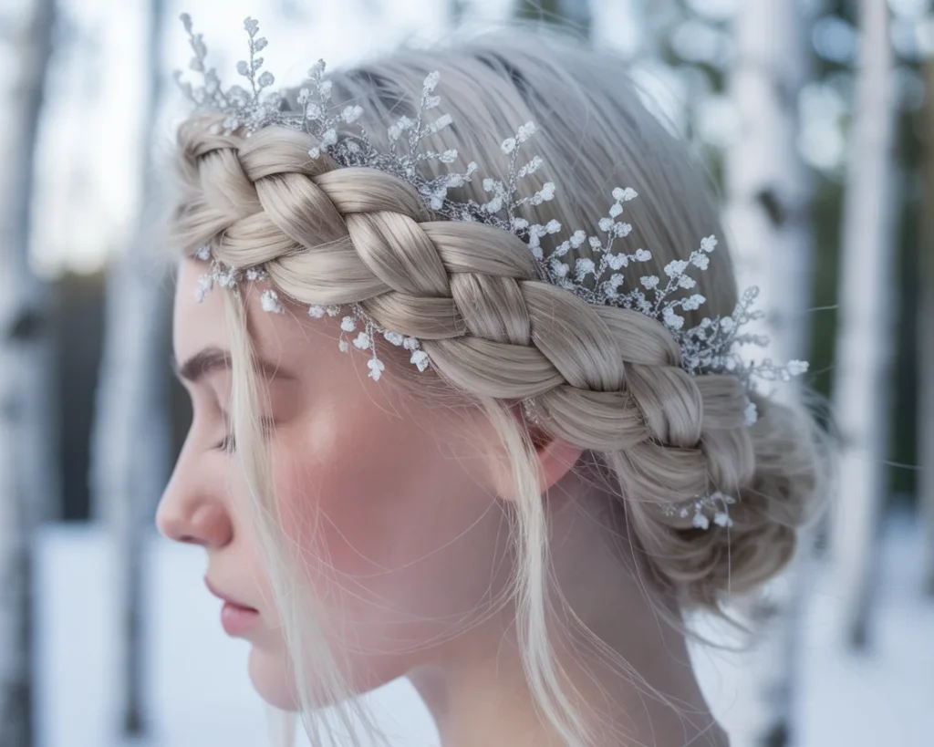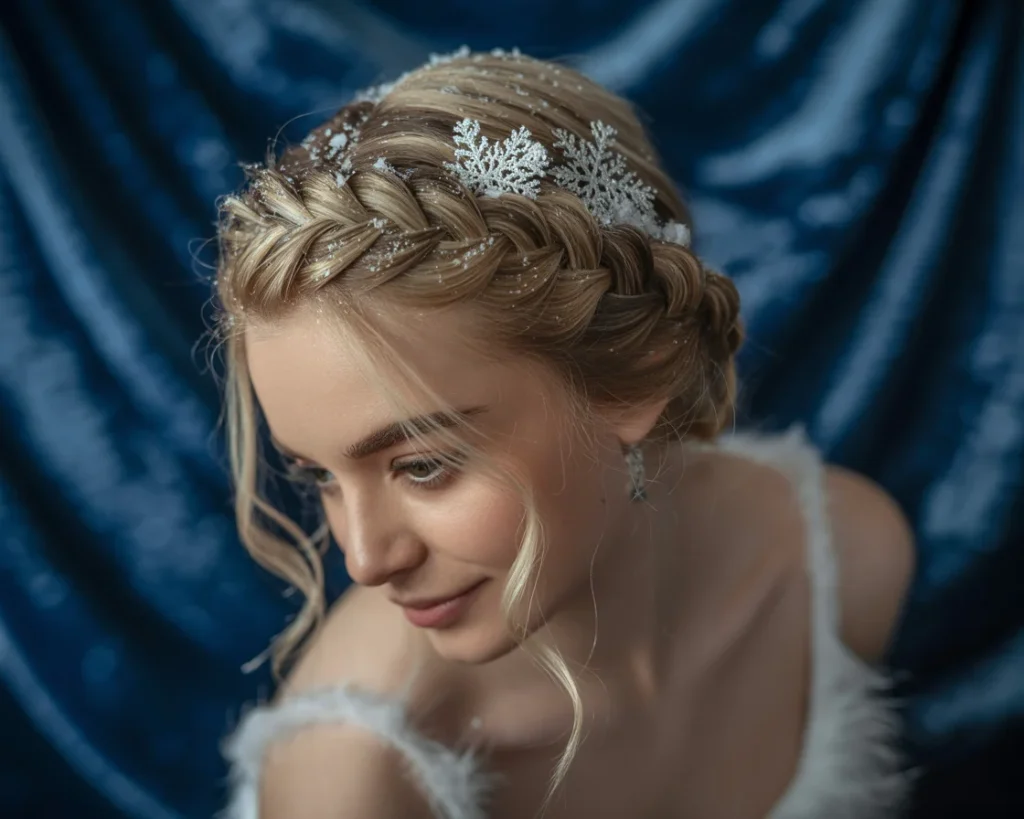 A braided crown brings sophistication to your look, especially when you add a touch of snowy elegance. Begin by creating two braids from either side of your head and wrap them around to form a halo-like crown.