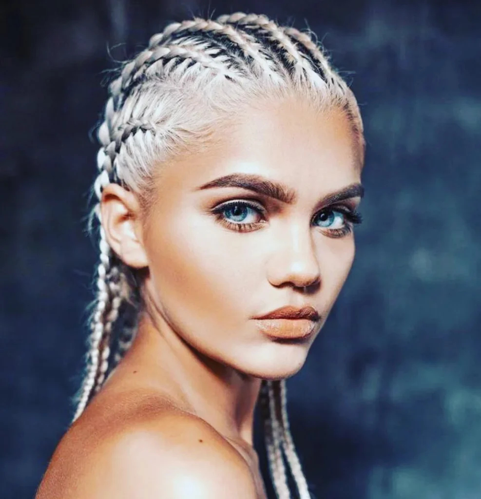 This snowy braided beauty showcases the elegance of a classic style with a frosty twist. Two neat, thick braids are woven from the roots, framing the face beautifully.