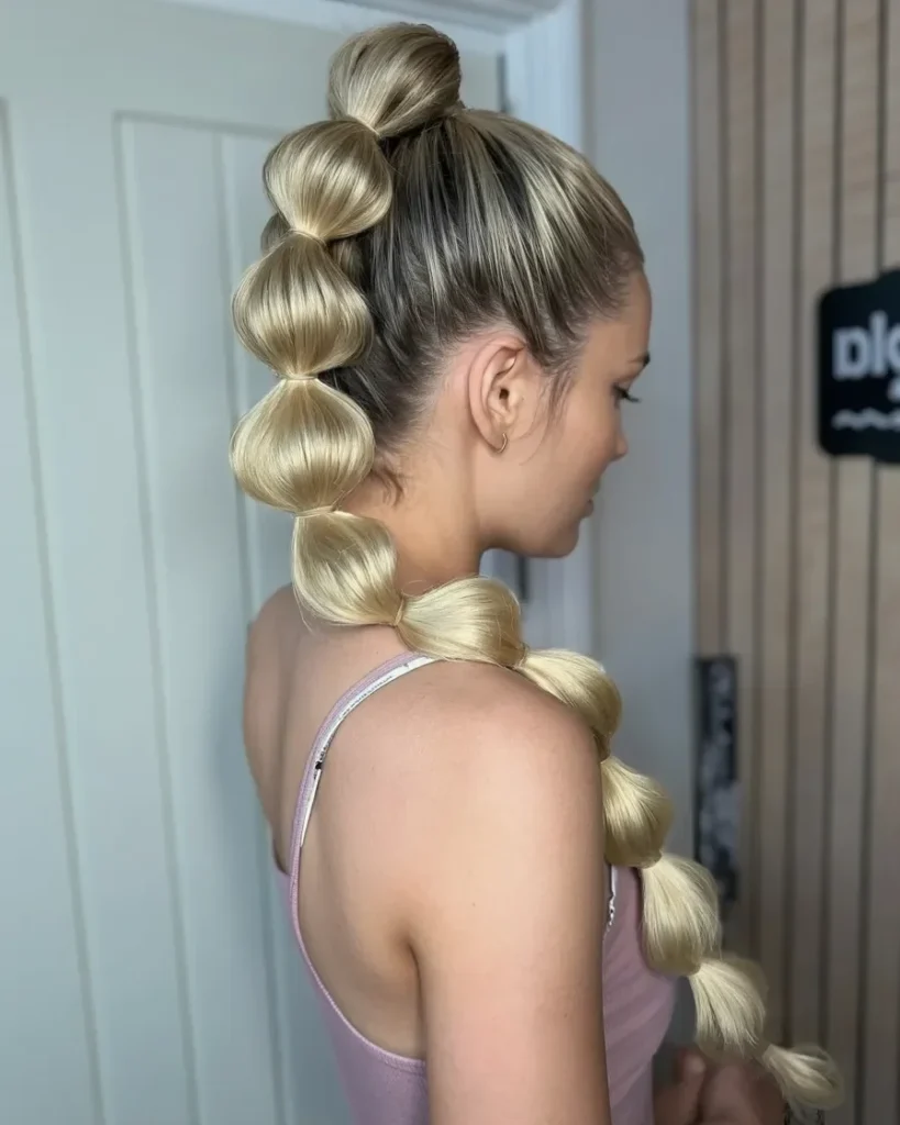 The ponytail is divided into sections, each secured with elastics to create “bubbles” of hair. These sections not only give the hairstyle a trendy, playful feel but also ensure that your hair stays firmly in place throughout any activity. The clean, sleek top section leads to a fun and bouncy look with the bubbles cascading down.