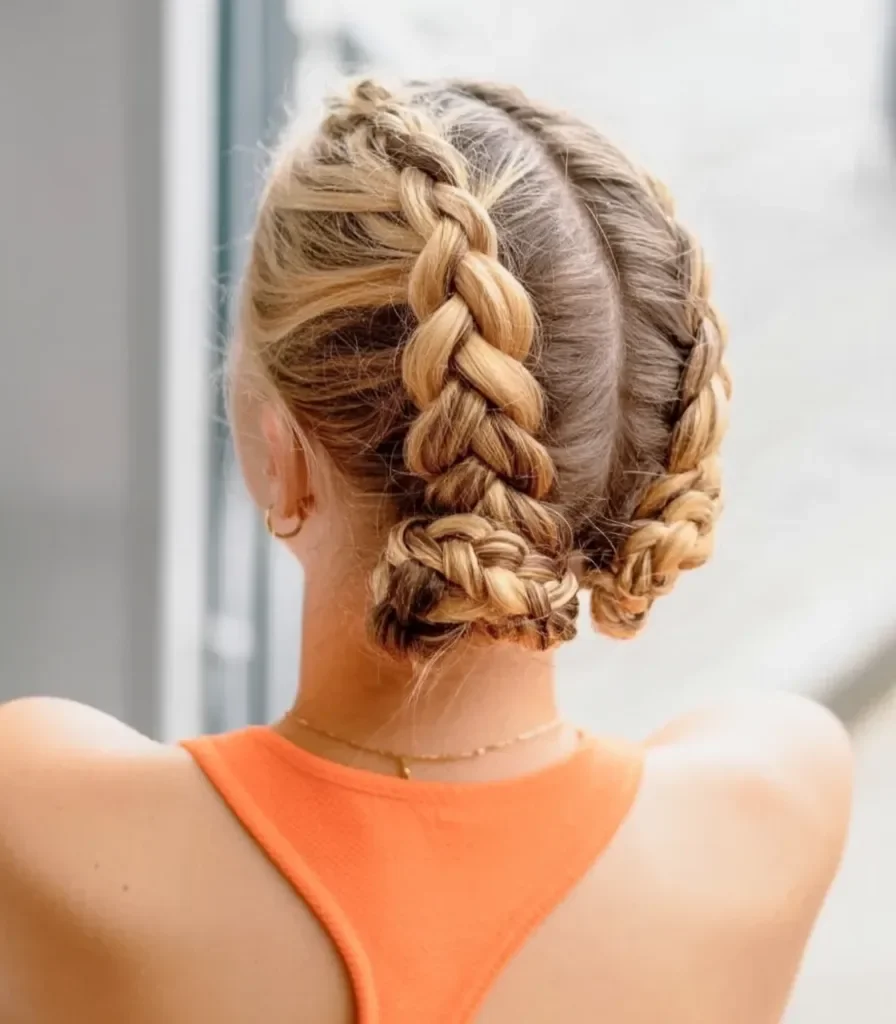 The braids are tightly woven, offering a neat and secure foundation that stays intact no matter the intensity of your workout. By twisting the ends of the braids into buns, this style provides extra control and keeps hair away from your face, making it ideal for sports like tennis or cycling.