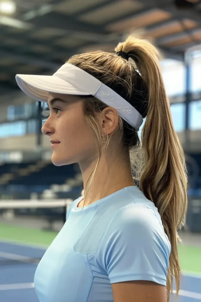 This hairstyle is perfect for women who want a functional yet stylish look during sports or workouts. The high ponytail keeps your hair secure while allowing freedom of movement, so you can focus on your performance. Paired with a sports visor, this style provides extra sun protection, ensuring your hair stays in place and you stay comfortable.