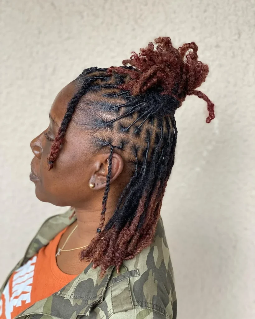 Gathering the upper section into a small bun adds height and personality, while the auburn-tinted ends introduce a warm contrast that complements darker roots beautifully. Each loc maintains a defined texture, showing the beginning stages of a maturing journey.