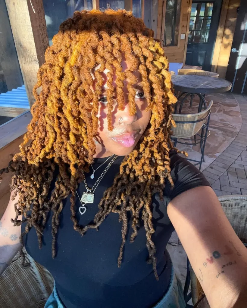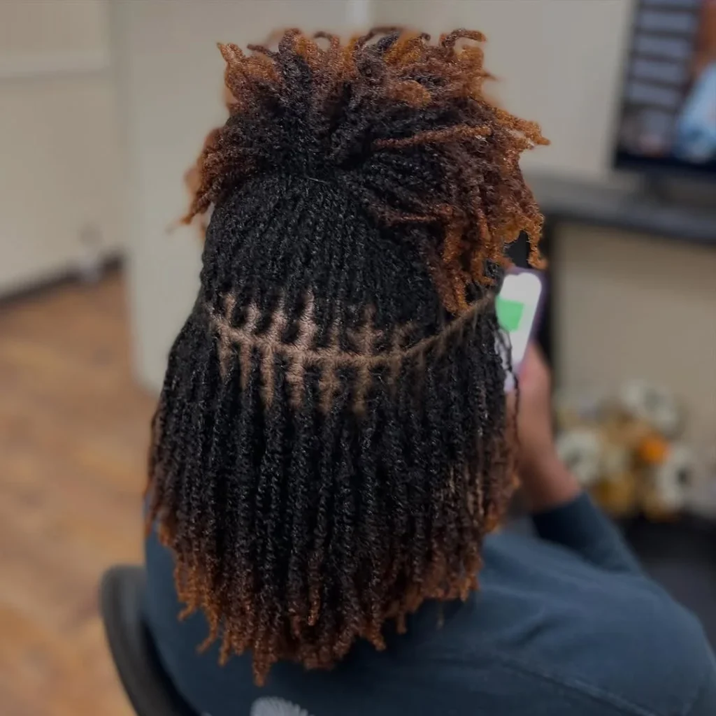 Vibrant and full of texture, these curly two-tone starter locs bring together rich shades of honey and deep brown for a bold, eye-catching style. The curls at the ends create movement and bounce, giving the locs a soft, lively finish that frames the face beautifully.
