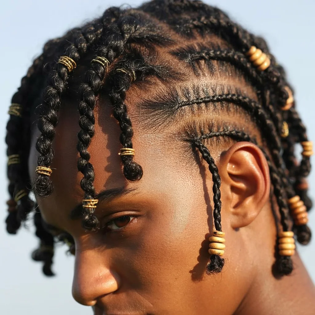 Small wooden and gold beads are added for flair, giving the style a cultural touch that celebrates heritage and creativity. The twists frame the face in a soft, confident way while keeping the look manageable and neat.