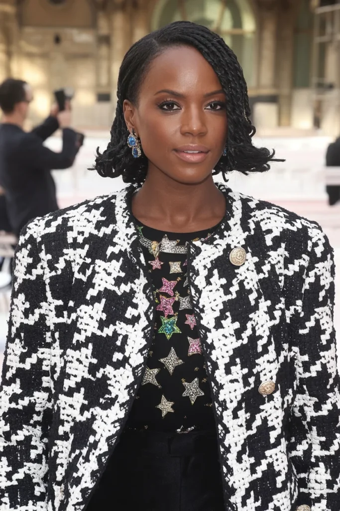 These stunning cornrow box braids bring structure and confidence to short locs while keeping a neat and elegant look. The braids are skillfully parted and feed into small, uniform sections that frame the face beautifully.