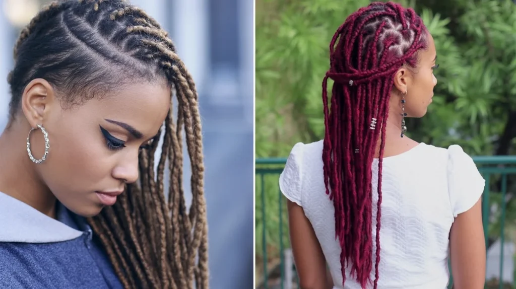 On the right, deep burgundy locs styled with small gold cuffs bring warmth and vibrancy, offering a beautiful contrast to darker skin tones. The half-up twist adds a touch of elegance while keeping it practical for everyday wear.