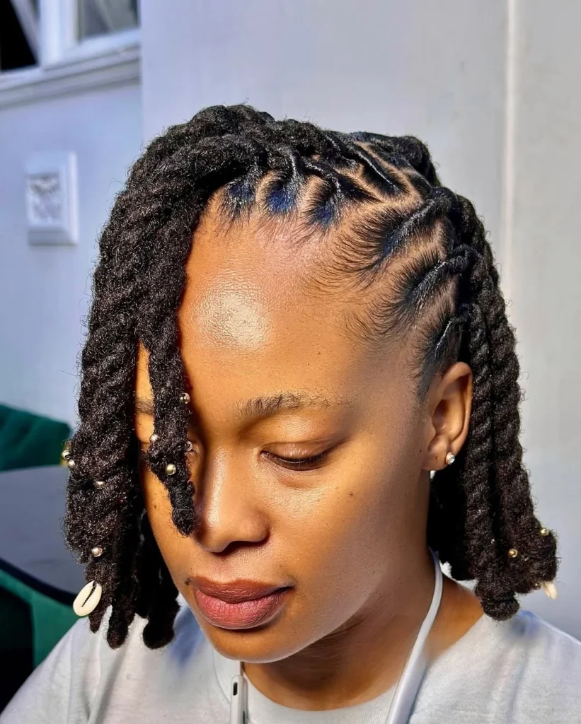 The addition of gold beads and cowrie shells gives this look a cultural touch, celebrating heritage and self-expression. The soft twists fall naturally around the face, creating a gentle, feminine silhouette that suits both everyday wear and special occasions.