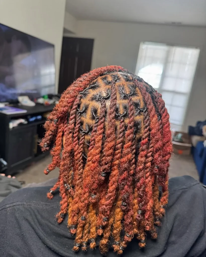 Vibrant and full of life, these two-strand twist starter locs bring a bold statement to short hair. The deep red ombre transitions beautifully into warm copper tones, giving the hairstyle depth and a touch of creativity.