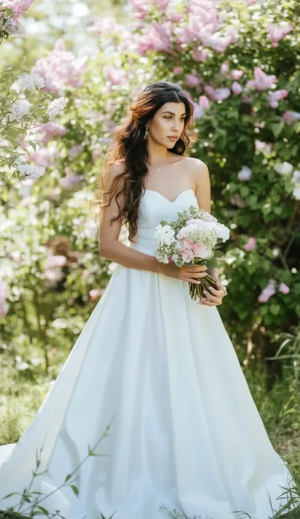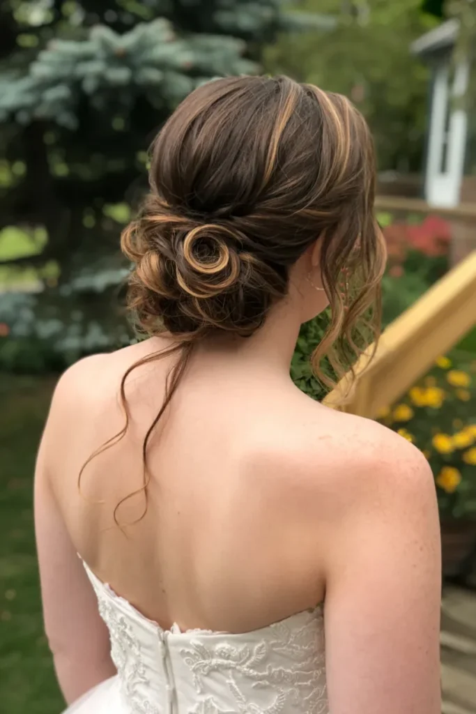 With its gentle volume and clean finish, this hairstyle works beautifully with a strapless wedding dress, allowing the neckline to shine. The addition of soft, flowing curls creates a timeless and graceful look that complements the simplicity of the gown. For added sophistication, delicate accessories like a small flower pin or crystal hairpins can be tucked into the bun.