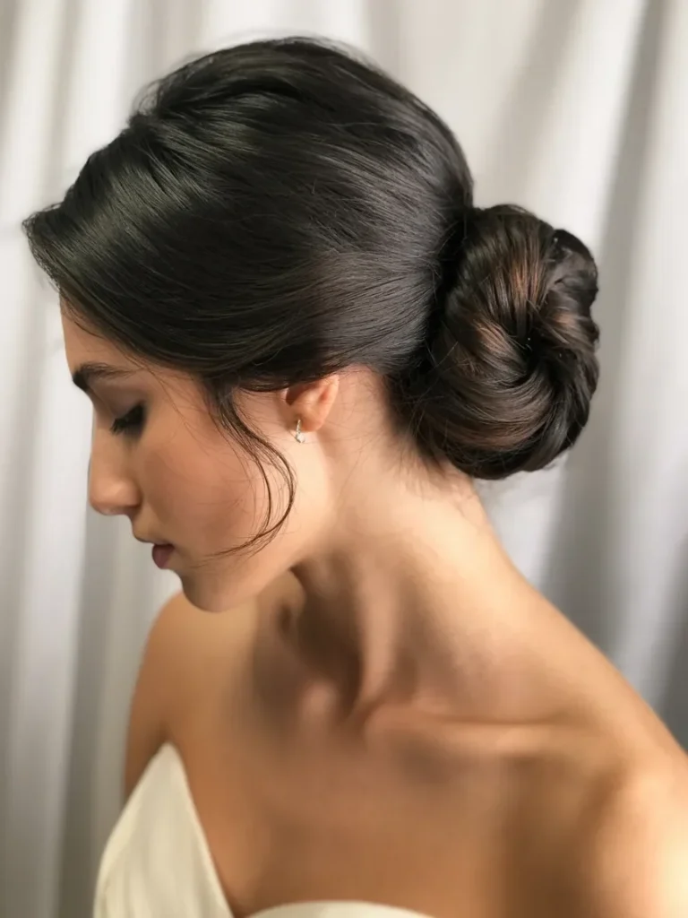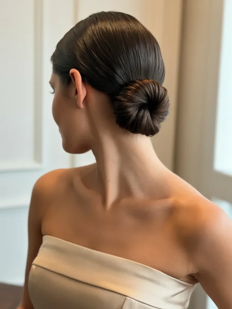 The smooth finish of the bun adds a modern touch to this timeless style. Subtle details, such as soft curls or wisps of hair at the temples, can give this look a relaxed, yet chic vibe. Perfect for a formal affair, this hairstyle provides a clean and sophisticated aesthetic that complements the neckline of a strapless gown.