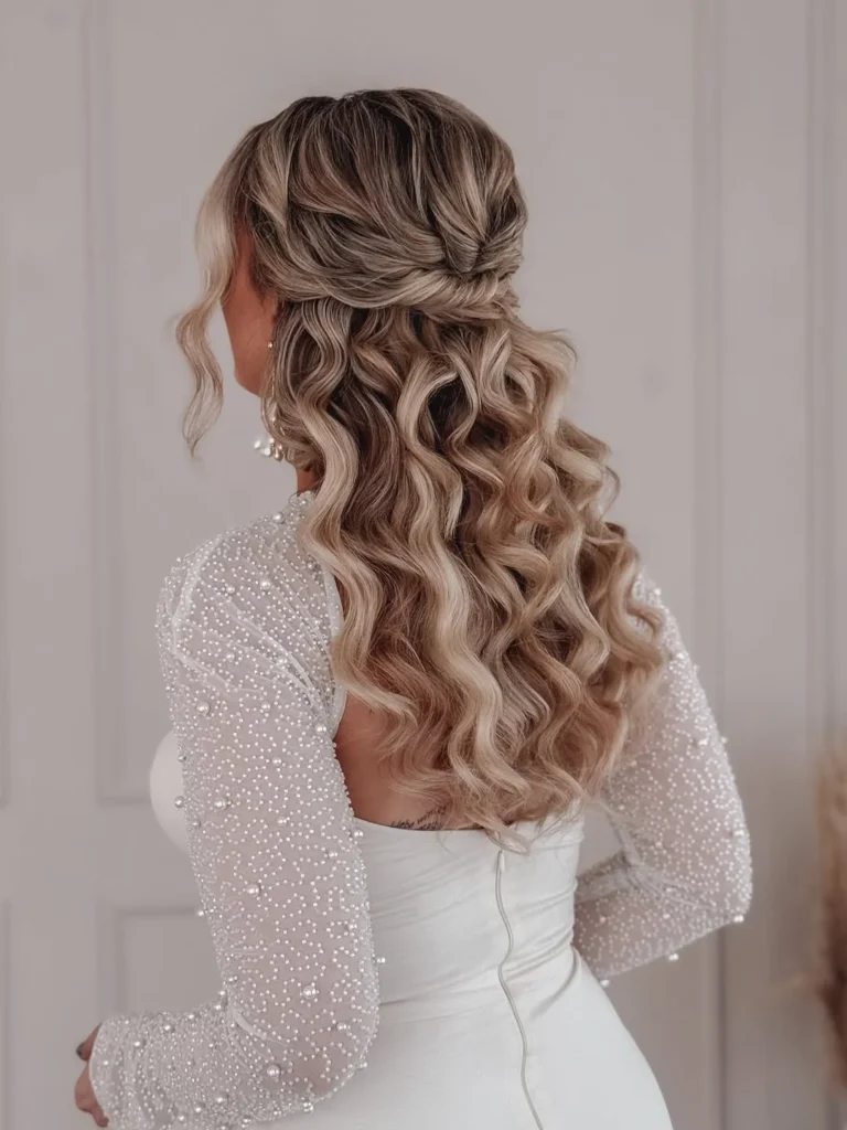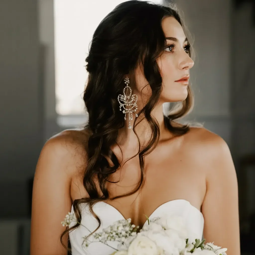 A stunning pair of statement earrings elevates the overall look, adding a touch of glamour without overpowering the soft elegance of the hair. The delicate curls and the shimmering earrings work harmoniously to create a sophisticated bridal style that’s both modern and timeless.