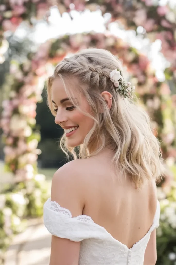 The braid helps keep hair out of the face, allowing the shoulders and neckline of the strapless gown to be fully showcased. This style is especially suitable for outdoor or garden weddings, where the soft waves complement the natural surroundings. The delicate flowers bring a rustic yet chic feel, perfectly aligning with a bohemian or vintage-inspired wedding theme.
