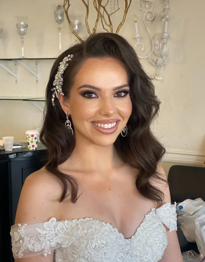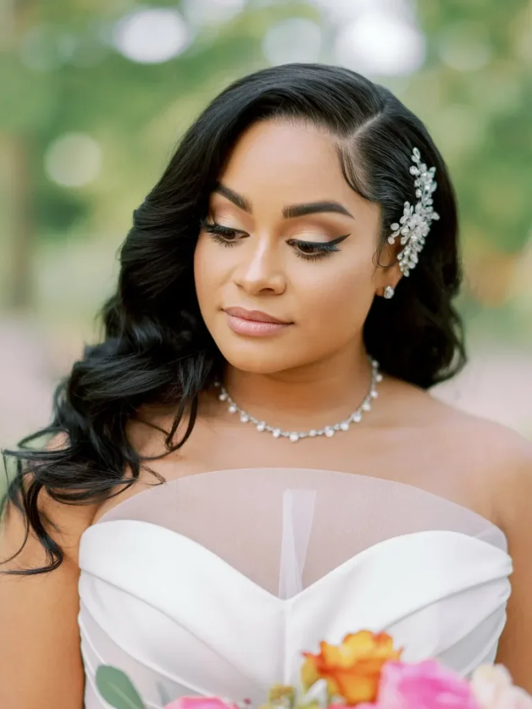 The clean side part frames the face beautifully, creating a flattering structure that complements the bride’s features. The waves give a romantic, effortless appearance while still looking polished. Adding a floral or jeweled pin enhances the style, bringing a modern yet timeless feel to the overall look.