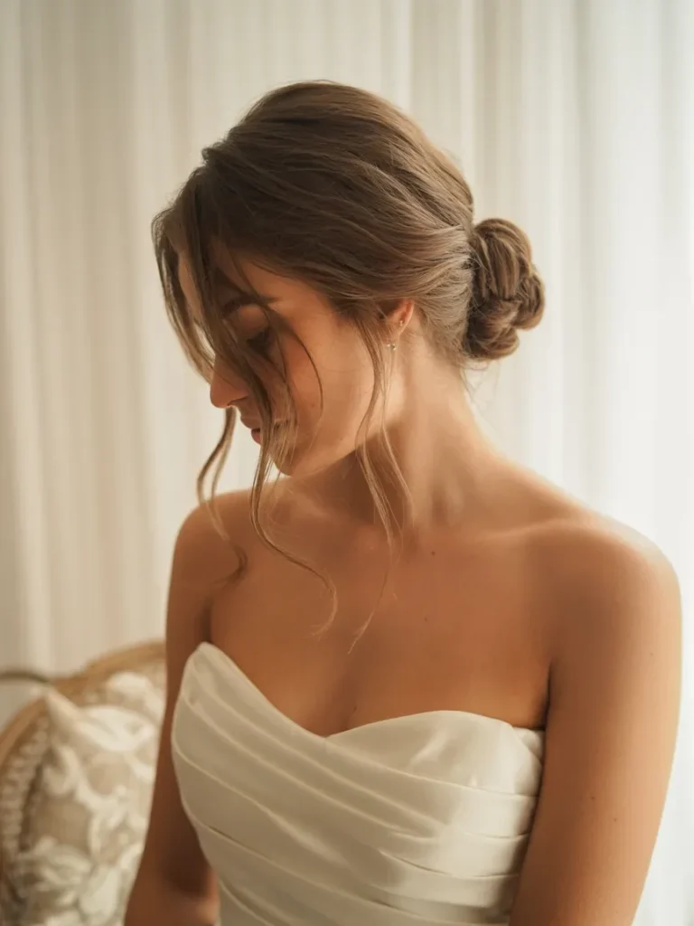 This low bun hairstyle offers a sleek, modern look that enhances the clean lines of a strapless wedding dress. The hair is gathered neatly at the nape of the neck, creating a polished and refined silhouette. The simple yet elegant bun is complemented by delicate face-framing strands, adding softness and a touch of romance to the overall style.