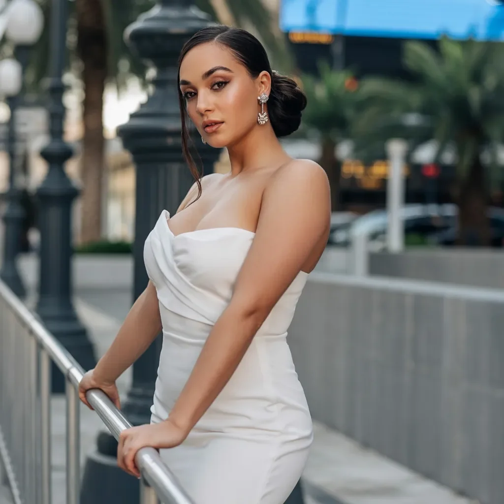 The hairstyle is enhanced with statement earrings that add an extra layer of glamour, balancing the minimalism of the bun. The makeup is soft yet striking, with neutral tones that allow the hair and jewelry to take center stage.