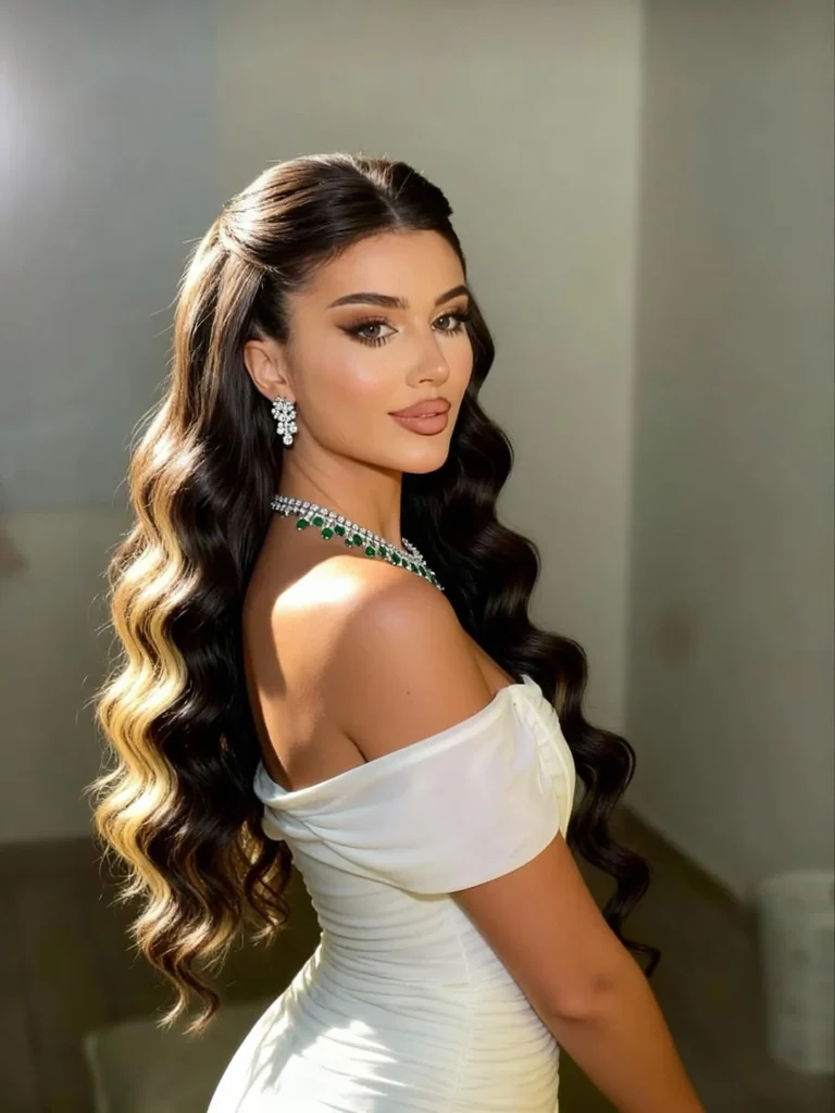 The style is complemented by subtle volume at the roots, giving the hair a fuller appearance. The soft waves cascade down the back, creating a romantic and airy feel. A statement piece of jewelry, such as the diamond earrings and emerald necklace in the image, elevates the overall bridal look, adding a touch of glamour without overpowering the elegance of the waves.
