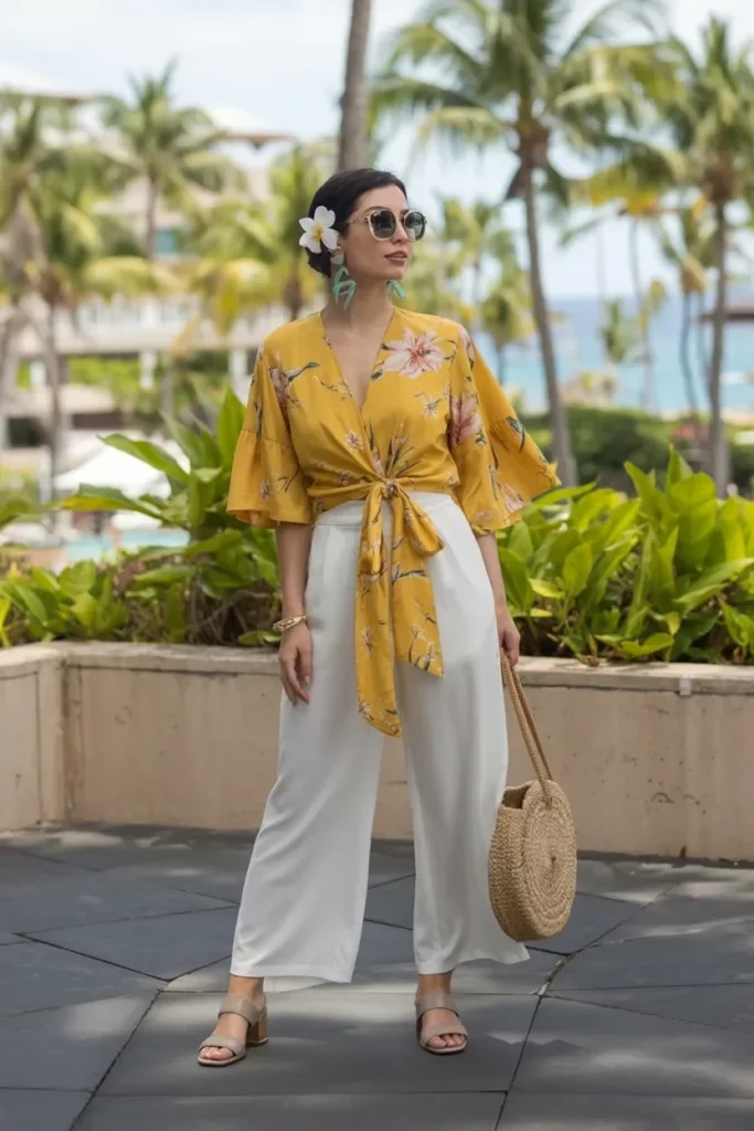 This outfit captures the vibrant, relaxed essence of Hawaiian style. The yellow floral tie-front blouse brings a burst of color, reflecting the island’s tropical beauty. The lightweight fabric and billowy sleeves make it comfortable for any outdoor activity.