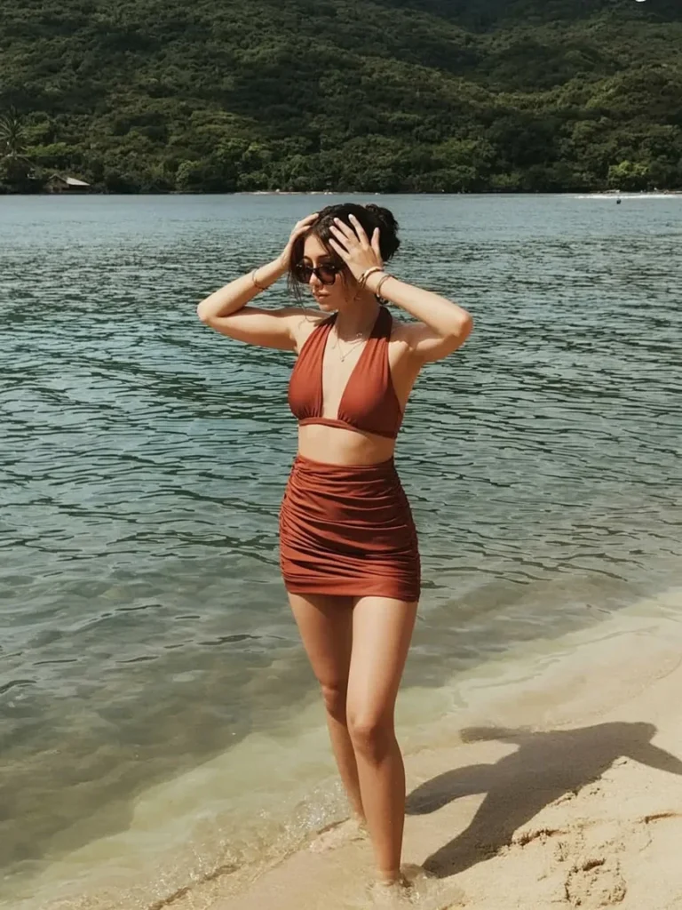 With the tropical backdrop and a refreshing ice cream in hand, this outfit is all about enjoying the island’s relaxed and vibrant atmosphere. Whether you’re walking along the beach or heading out for lunch, this look is bound to turn heads.