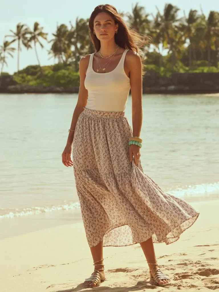 This combination of a simple white tank top and a flowy floral skirt captures the carefree spirit of a Hawaiian day. The soft, neutral tones of the skirt create a relaxed, beachy feel, while the floral pattern adds a touch of nature and vibrancy.