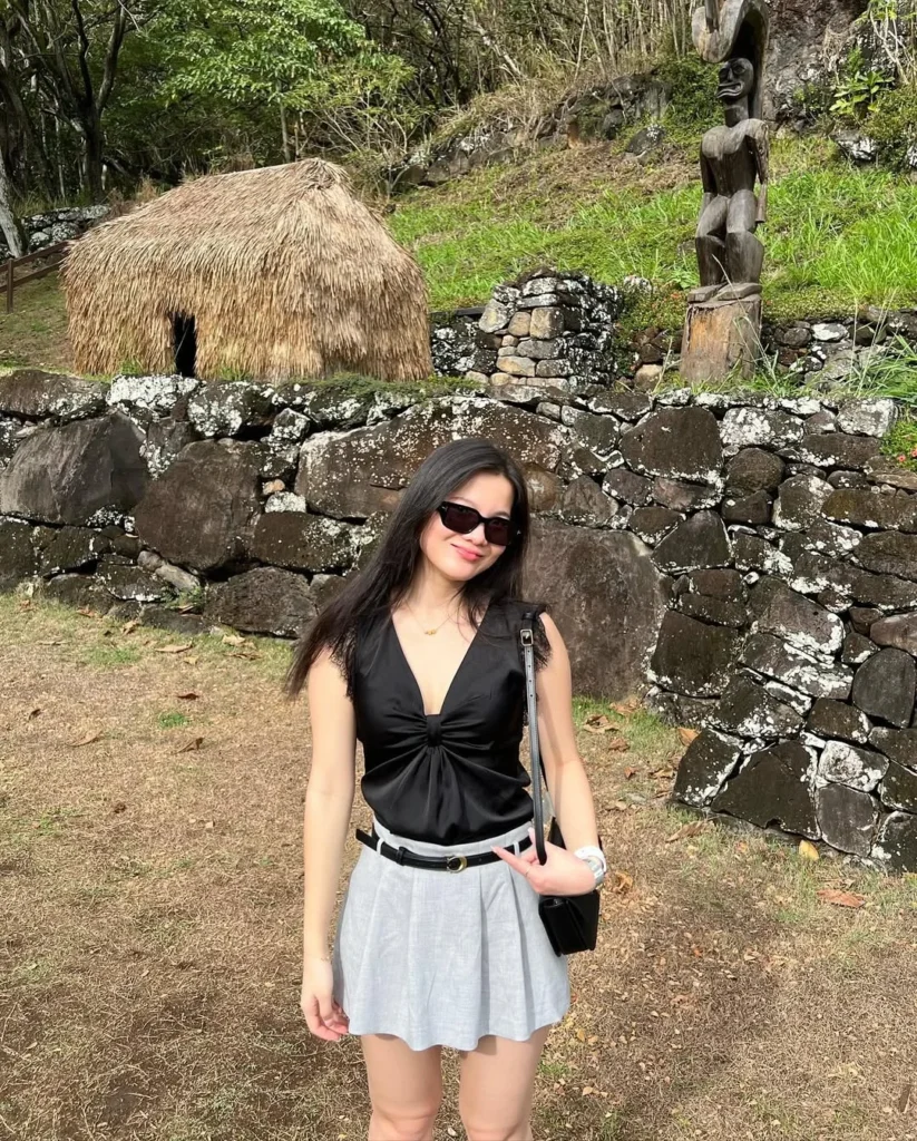 Accessorize with minimal jewelry and large sunglasses for that effortlessly chic vibe. Whether you’re enjoying a rooftop view or strolling the beach, this outfit embodies the spirit of a Hawaiian escape.
