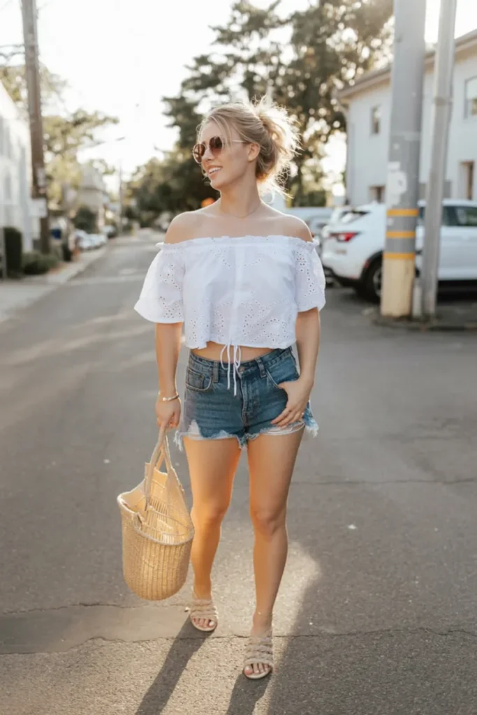 This outfit radiates relaxed charm, perfect for exploring Hawaii’s laid-back streets. The off-the-shoulder white blouse adds a touch of femininity with its delicate eyelet pattern. Pairing it with denim shorts brings a balance of comfort and style, ideal for a warm day.
