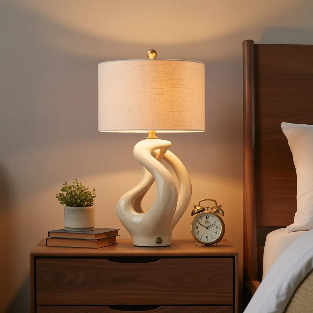 This sculptural ceramic lamp anchors the nightstand with soft curves and warm light that instantly calms the room. A neutral fabric shade spreads a gentle glow across the wall, creating a cozy mood for evening reading and quiet moments.