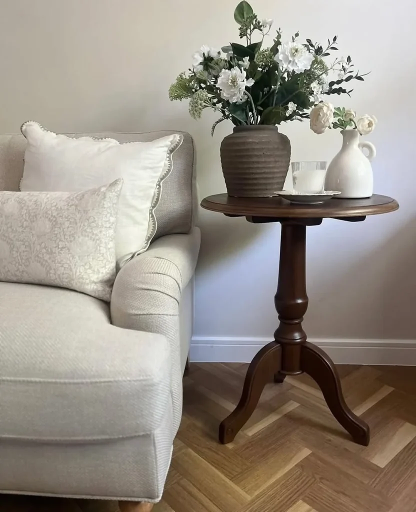 A round wooden pedestal table brings timeless charm beside the upholstered seating, adding warmth through its rich tone and curved base. Its compact surface feels refined yet functional, making it a beautiful option within 15 styling nightstand ideas.