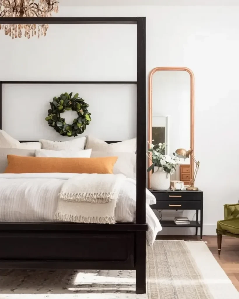 Beside the bed, a tall arched mirror framed in warm metal reflects natural light and visually expands the corner. Fresh greenery arranged in a ceramic vase softens the darker furniture and introduces movement that feels calm and welcoming.