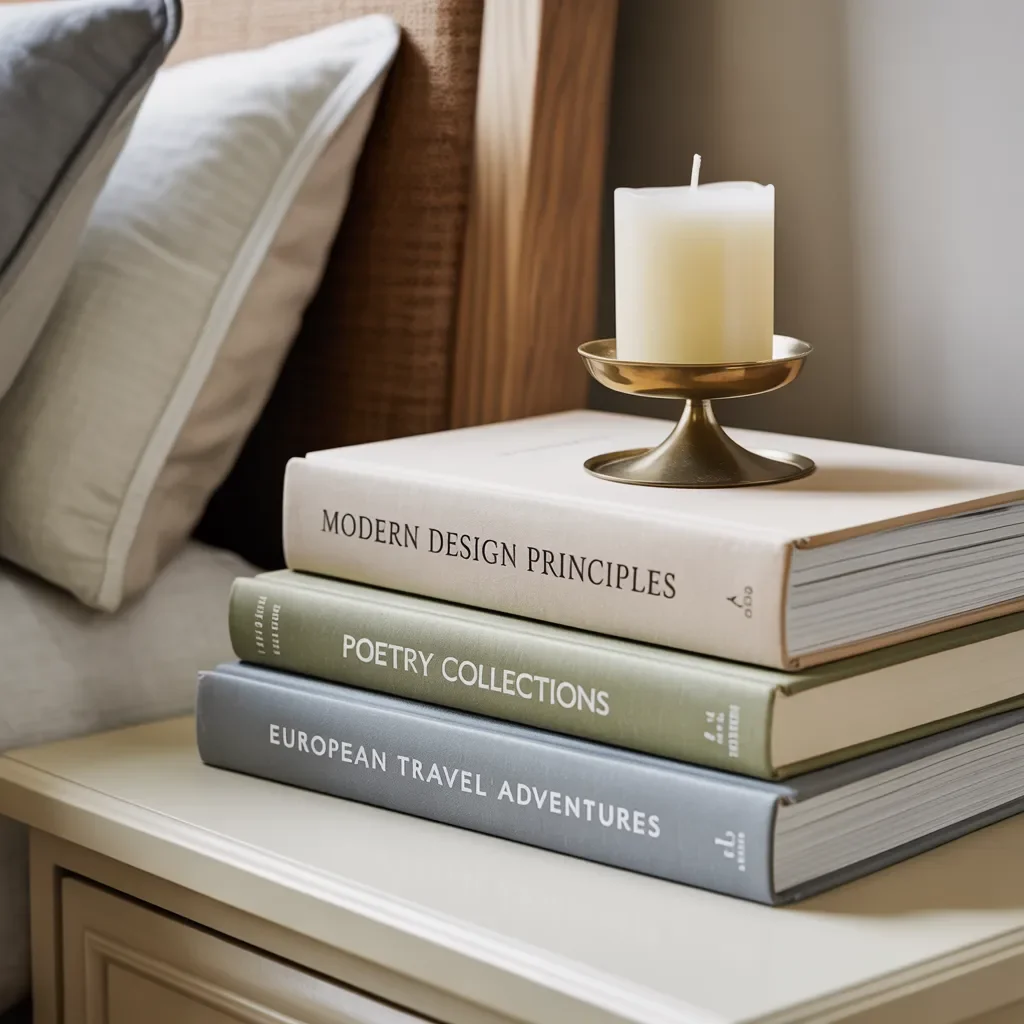 A stack of curated hardcover books creates height and structure on this nightstand while adding personality through thoughtful titles. Soft neutral covers keep the palette calm and blend beautifully with the warm wood headboard in the background.