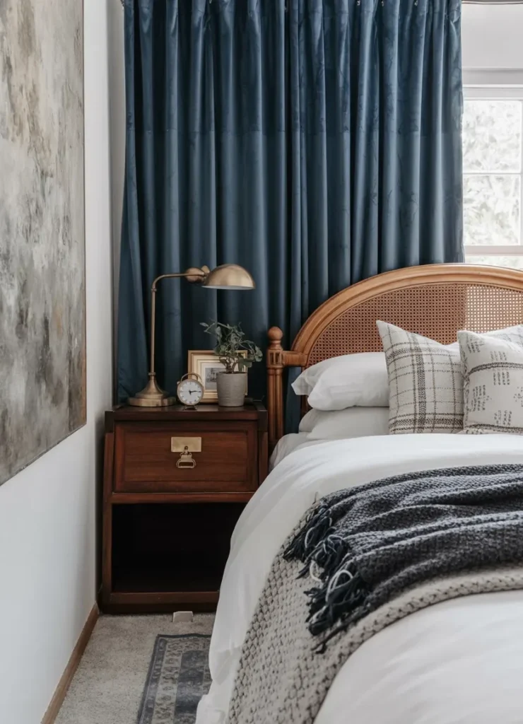 Behind the setup, navy curtains frame the space with depth, creating a strong backdrop that highlights the styling on the table. A woven headboard softens the scene, balancing the darker elements with natural texture and light tones.