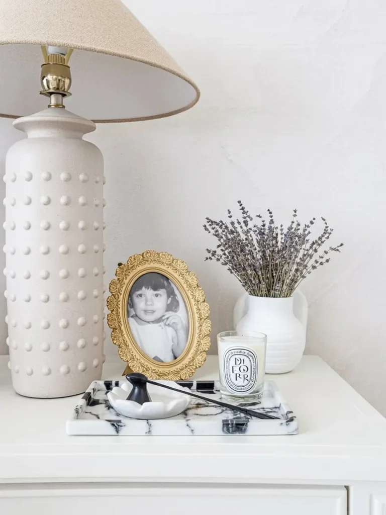 Next to the lamp, a gold framed photograph adds a personal touch that feels intimate and meaningful. A marble tray anchors smaller items like a candle and decorative accent, keeping the surface organized and refined.