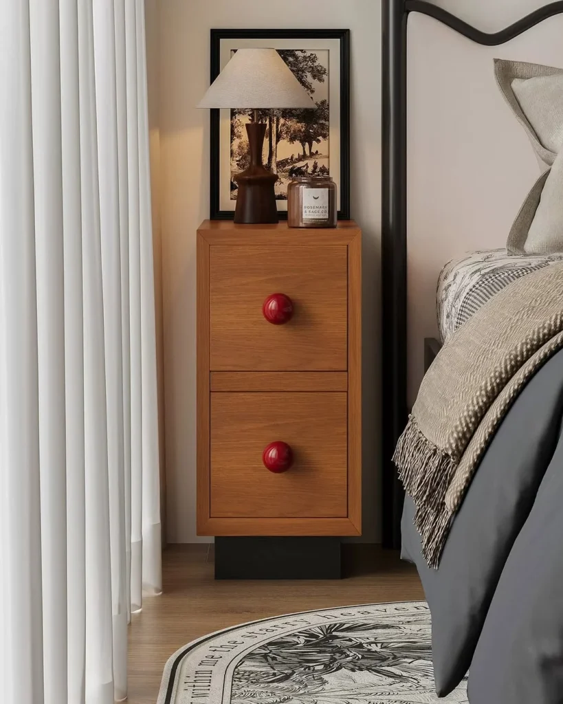 Bold red drawer knobs add personality and break up the natural wood tone with a subtle pop of color. That small design choice transforms a simple storage unit into a focal point that feels curated and intentional.
