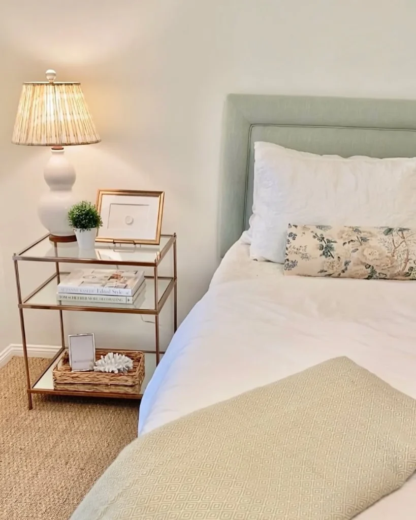 A sleek glass and gold frame nightstand adds lightness to the bedroom while keeping the layout open and airy. Its slim structure feels elegant and refined, making it a standout choice within 15 styling nightstand ideas.