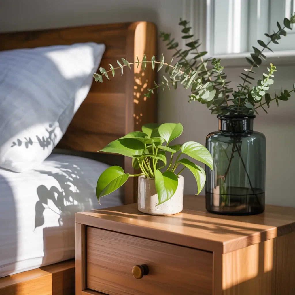 Rich wood tones from the nightstand and bed frame ground the styling and add warmth to the bedroom palette. Smooth ceramic paired with natural greenery creates texture contrast that keeps the arrangement visually engaging.