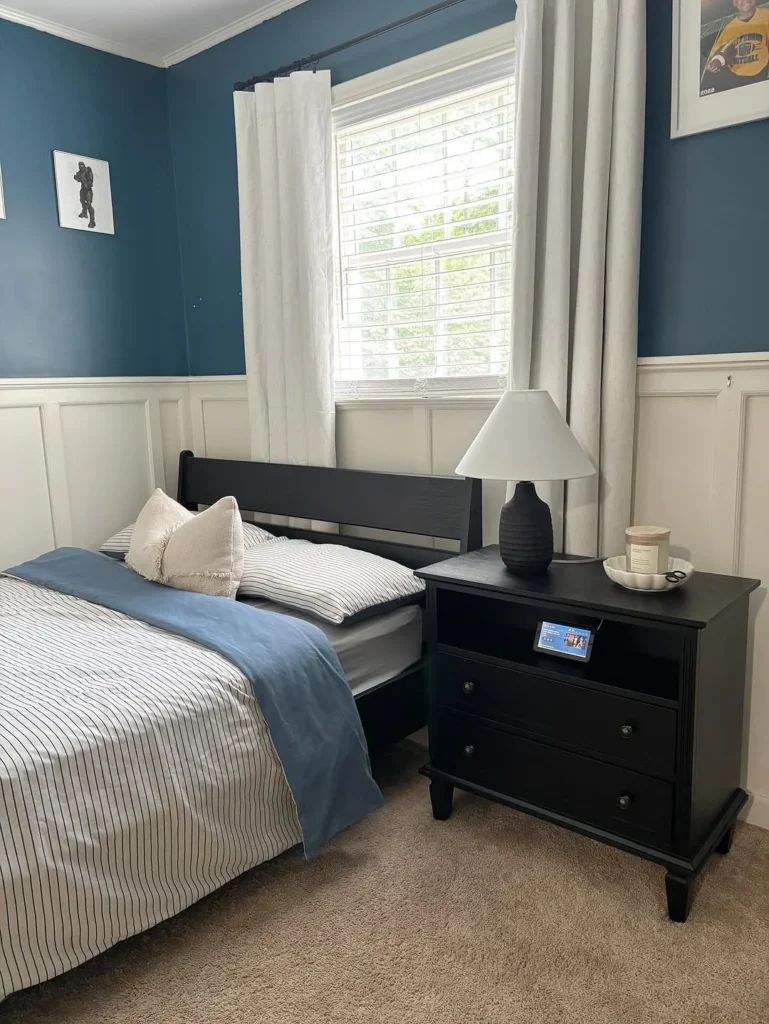 Deep blue walls paired with crisp white trim create a bold backdrop that makes the black nightstand stand out with confidence. Clean lines and structured drawers give the bedside area a grounded, organized presence.