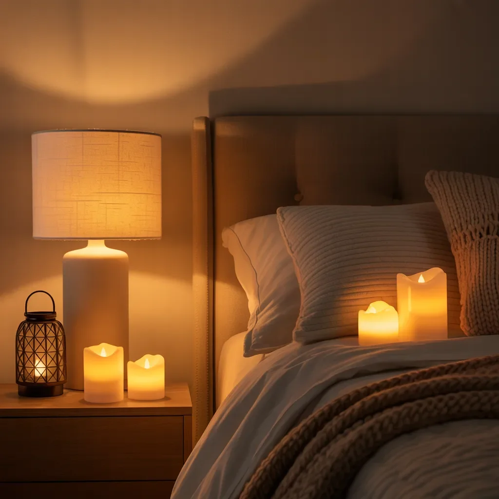 Soft amber light fills the bedroom corner as a simple table lamp casts a warm halo across the wall and headboard. Gentle candlelight layered on the nightstand adds depth and creates a calm setting that feels intimate and restful.