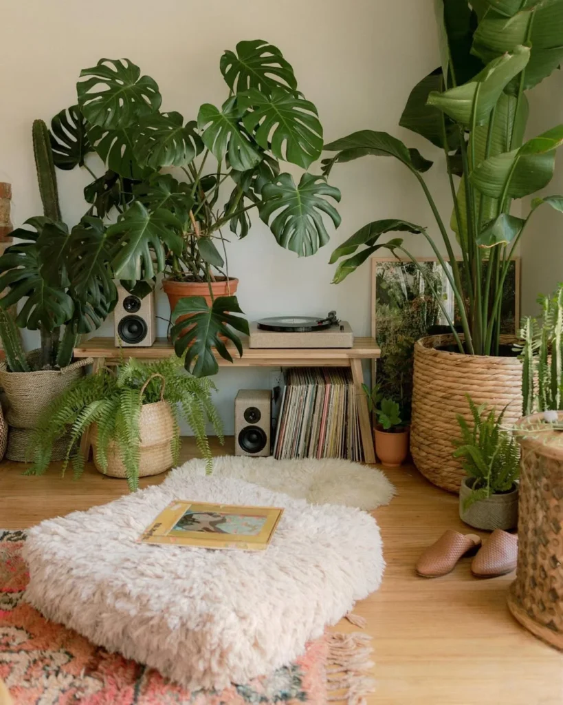 The mix of earthy tones from the plants and furniture, along with the modern design of the record player, strikes a perfect balance between comfort and style. The addition of a plush armchair invites relaxation, turning this corner into a delightful music and reading area.
