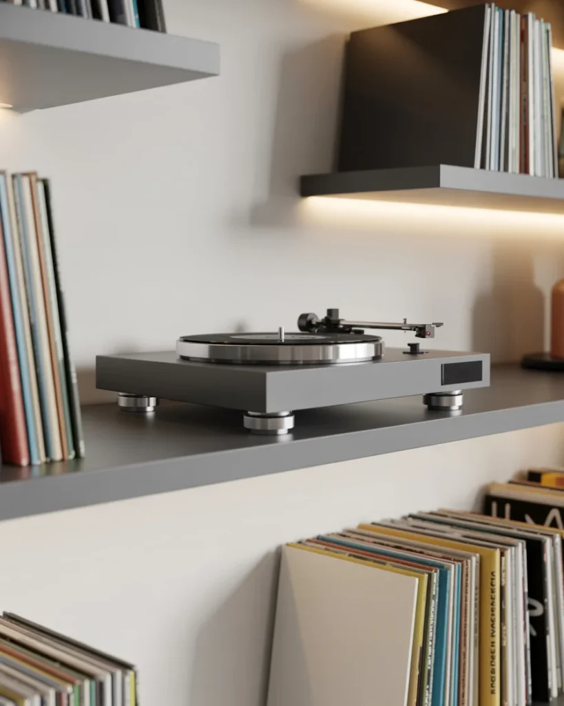 This minimalist record player setup is a true reflection of modern design. The turntable sits effortlessly atop a sleek, gray shelf, framed by clean lines and soft lighting that highlights its polished look. Surrounding the player, neatly stacked records are stored for easy access, organized in an aesthetically pleasing manner.