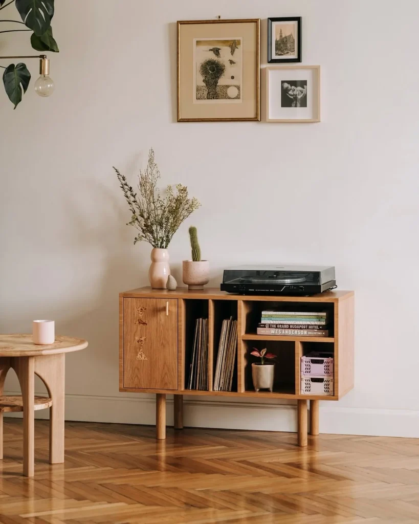 The open shelving below holds vinyl records and books, with each item neatly organized and within reach. The wooden texture and gentle hues of the furniture enhance the room’s cozy, warm vibe. Framed artwork above and decorative plants nearby complete the scene, transforming this space into a peaceful retreat where music and nature intertwine.