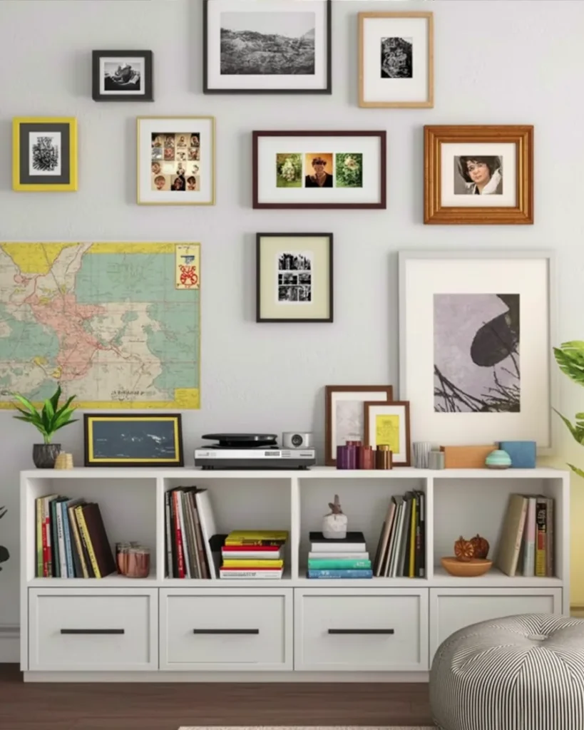 This stylish record player setup perfectly blends artistic decor with functional design. The turntable sits atop a modern white shelving unit, which holds a vibrant mix of books and decorative objects. Above, a gallery wall of eclectic framed photographs and prints adds character and personality to the space, creating a cozy yet creative vibe.
