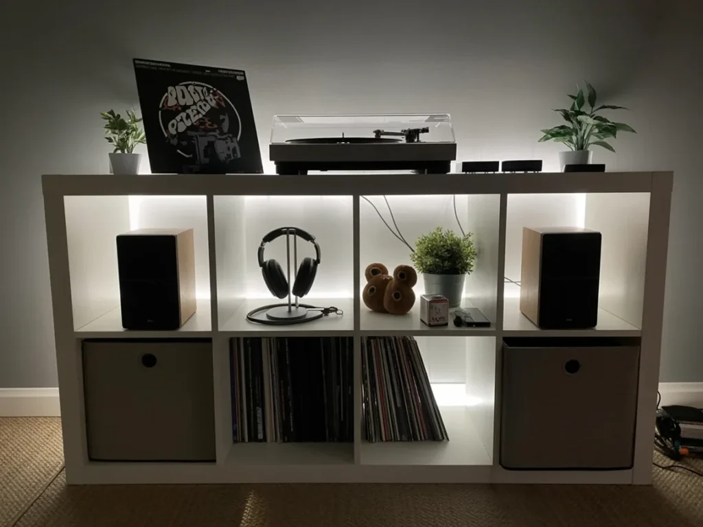 With speakers placed symmetrically on either side, this setup also integrates elements of both style and sound, making it a focal point in your space. Whether you’re playing your favorite albums or showcasing artwork, this setup offers a balance of form and function that is ideal for any music lover’s home.