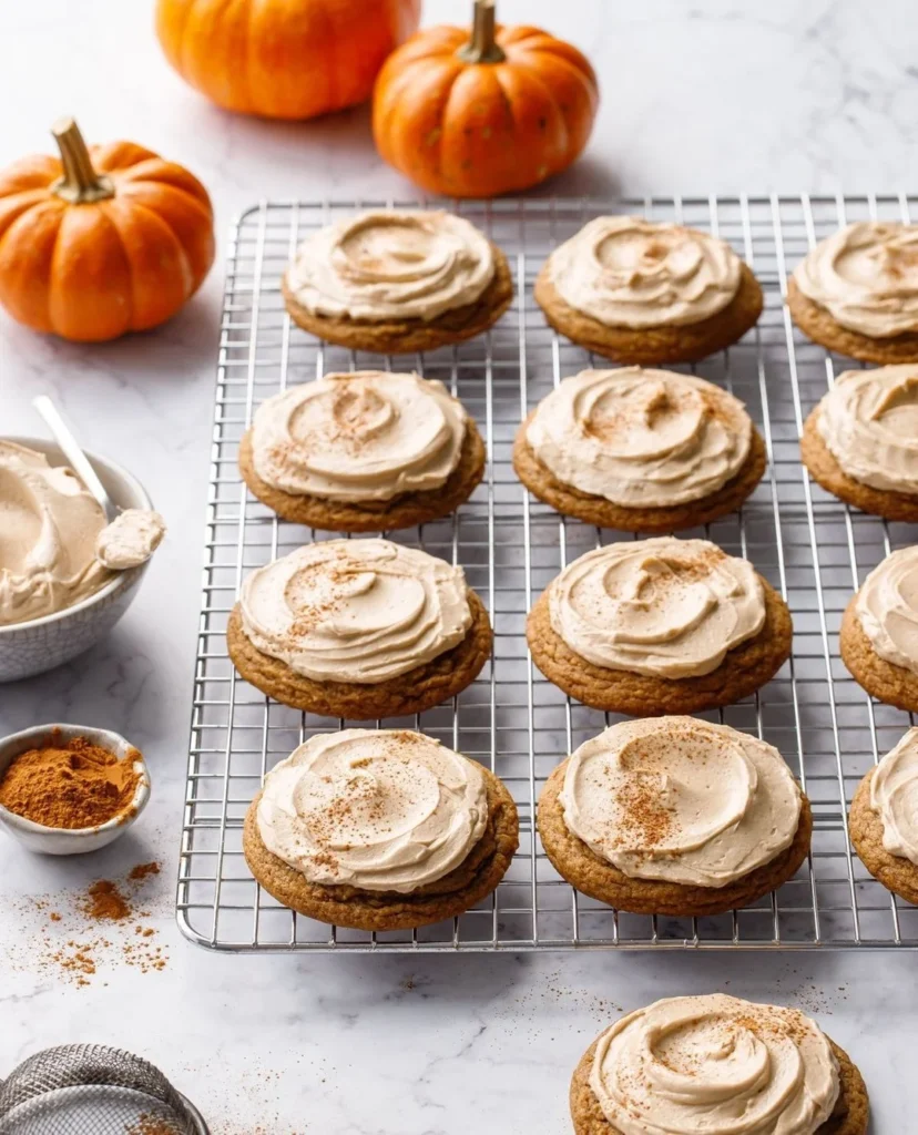 These pumpkin spice frosted cookies bring warm autumn comfort to any Thanksgiving table. Soft cookies sit under a creamy swirl of spiced frosting, creating a treat that feels cozy from the first glance. A light dusting of cinnamon on top adds a gentle hint of color and aroma.