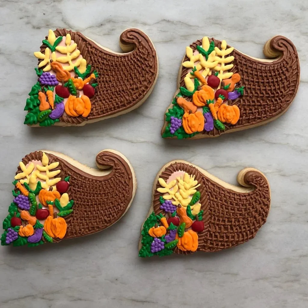 These cornucopia harvest cookies capture the heart of Thanksgiving with their warm colors and festive details. Each cookie is shaped like a classic horn of plenty, decorated with a textured basket pattern that feels rich and rustic. Bright icing pumpkins, grapes, leaves, and autumn vegetables spill from the opening, creating a cheerful symbol of abundance.