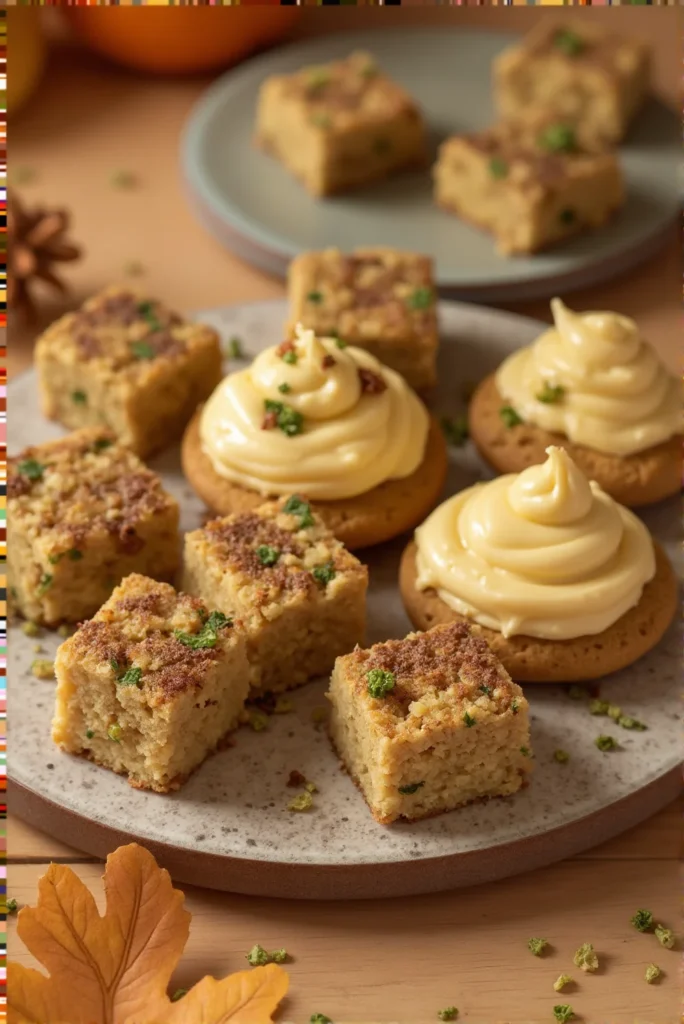 These spiced harvest cookie bites bring a warm, comforting touch to your Thanksgiving dessert table. Soft, crumbly squares sit beside round cookies crowned with rich, swirled frosting, creating a beautiful mix of textures and shapes. Each bite carries cozy fall flavors, highlighted by a gentle sprinkle of spices and tiny green accents that add a festive look.